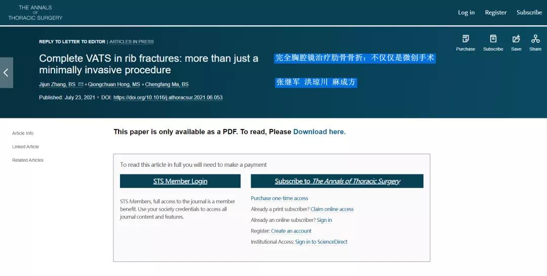 西脈國(guó)際醫(yī)療《完全腔鏡下記憶合金反向肋骨內(nèi)固定產(chǎn)品》在醫(yī)療器械行業(yè),雖不能說家喻戶曉,但在國(guó)內(nèi)已是遍地開花,自成功上市以來已經(jīng)在北京、山東、福建、四川、河北、廣東、江蘇、浙江、新疆、甘肅、湖南、云南、重慶、山西、湖北、江西、河南、陜西、遼寧、安徽、廣西等地區(qū)臨床成功應(yīng)用,并獲得業(yè)內(nèi)專家一致好評(píng),不僅如此,更是得到了美國(guó)專家的高度認(rèn)可,繼2021年3月“完全胸腔鏡肋骨骨折內(nèi)固定術(shù)”以原創(chuàng)文章形式在線發(fā)表于美國(guó)胸外科醫(yī)師學(xué)會(huì)官方期刊【胸外科年鑒】(Complete Video-assisted Thoracoscopic Surgery for Rib Fractures: A Series of 35 Cases)以來,2021年7月23日, Complete VATS in rib fractures: more than just a minimally invasive procedure”(完全胸腔鏡處理肋骨骨折:不僅僅是一種微創(chuàng)手術(shù))再次榮登美國(guó)胸外科醫(yī)師學(xué)會(huì)官方期刊【胸外科年鑒】(The Annals of Thoracic Surgery)。